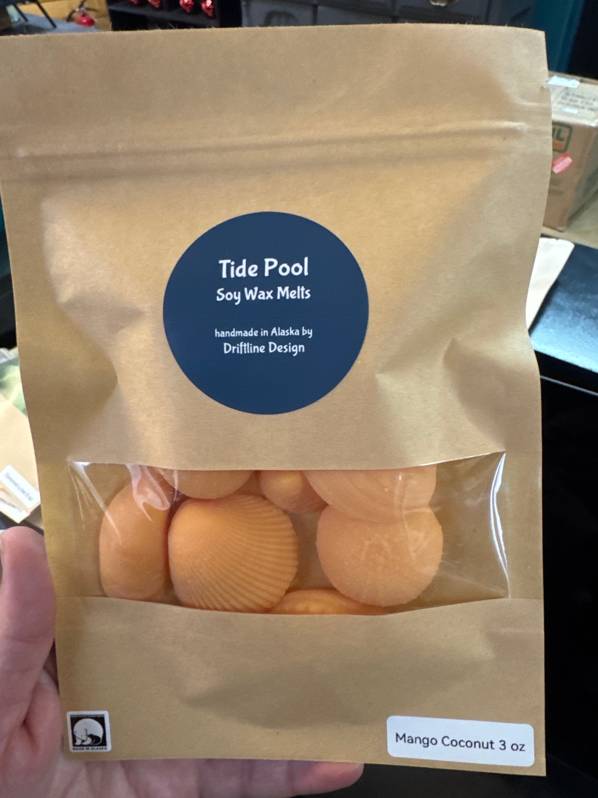Soy wax melts handmade on Prince of Wales, Alaska! Each melt is poured into a silicon mold 3D printed from sourced beach treasures.